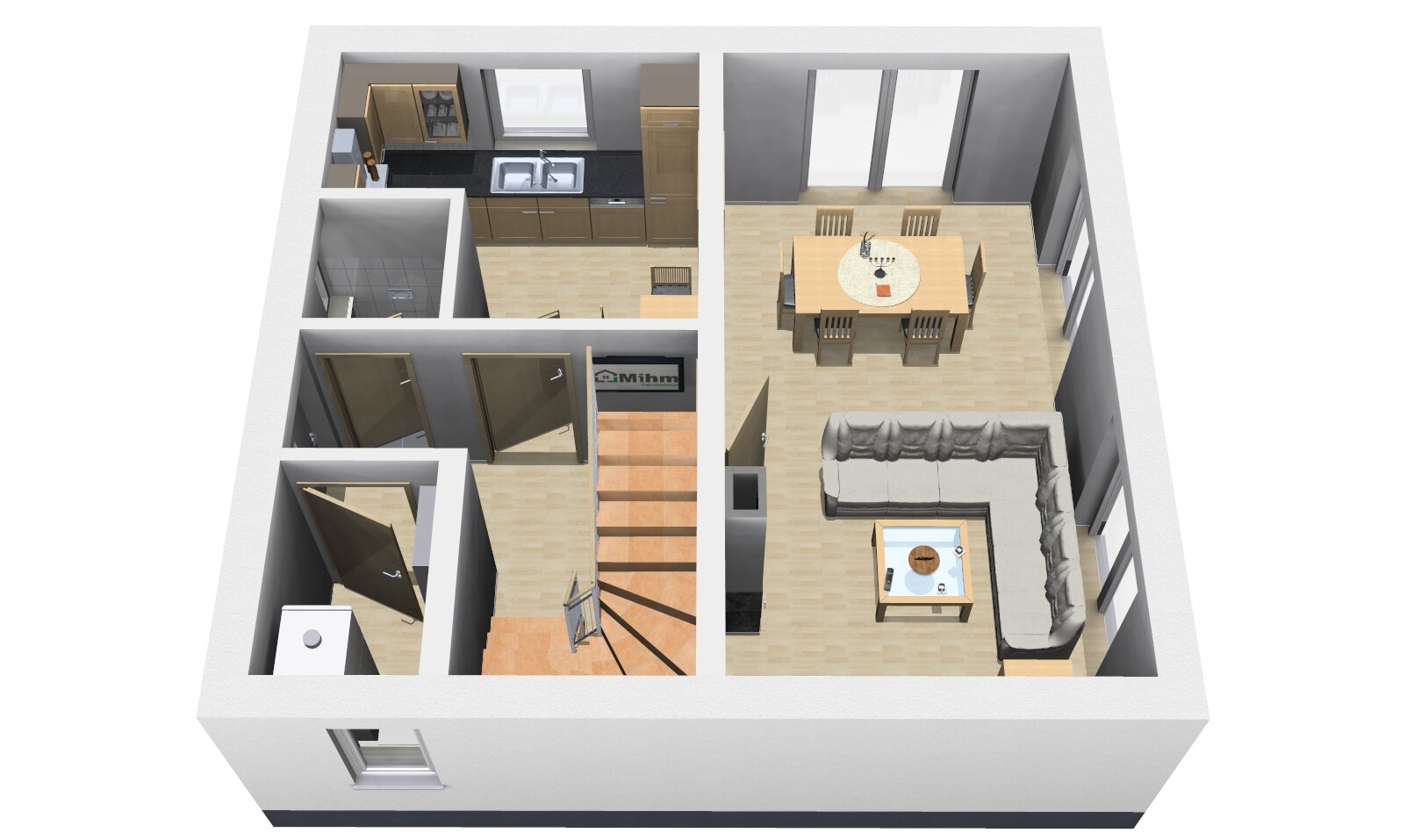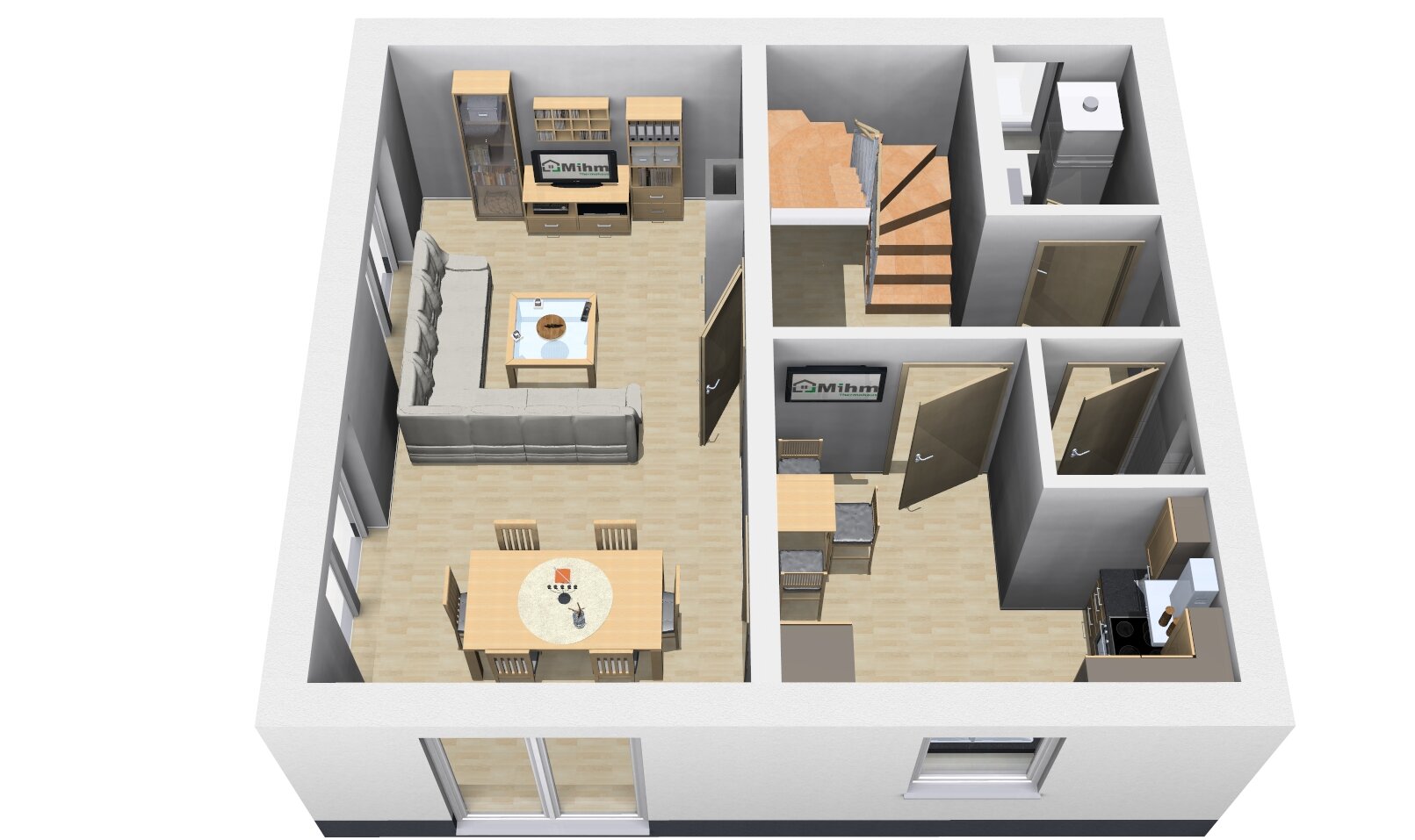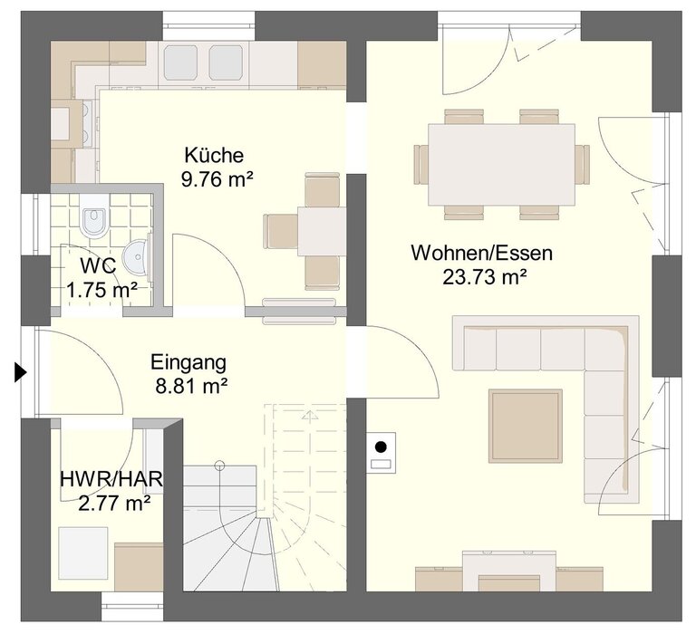 Die Gestaltung im Erdgeschoss schafft eine einladende und kommunikative Wohnfläche, während das Dachgeschoss vielseitige Nutzungsmöglichkeiten bietet.