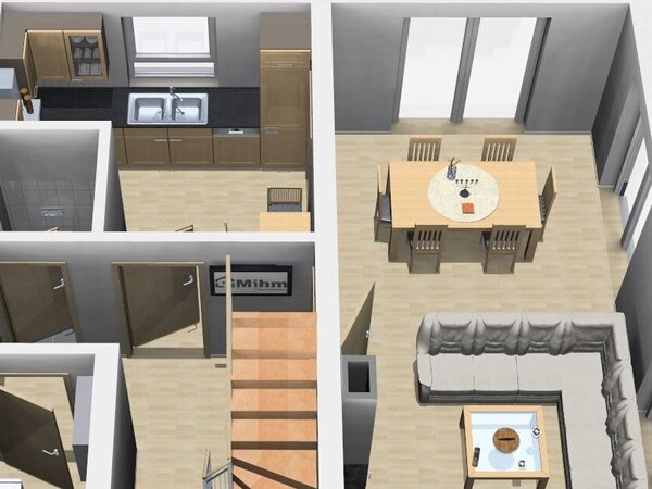 Die Gestaltung im Erdgeschoss schafft eine einladende und kommunikative Wohnfläche, während das Dachgeschoss vielseitige Nutzungsmöglichkeiten bietet.